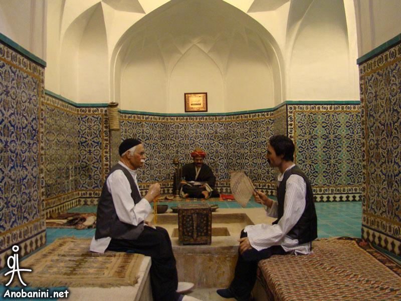 دراين موزه ديدني به کمک مجسمه هاي مومي بسيار زيبا و اشياء و وسايل گوناگون، آداب و سنن اصيل و گاه فراموش شده به نمايش گذاشته شده است. براي ديدار از گنجينه به ياد ماندني مردم شناسي گنجعليخان از نظر آنوبانینی بايد از سردر زيباي آن شروع کرد. جايي که آجرهاي ساده و نيلي، حاشيه اي از سنگ مرمر، نقاشيهاي زيباي سردر و مقرنس بندي زيبا نماي بيروني سردر حمام را در جلوه اي زيبا و با شکوه به نمايش مي گذارد و هر رهگذري را به درون فرا مي خواند. بر سردر حمام که بخشي از نقاشيهاي عهد صفوي آن به تازگي مرمت شده، کتيبه شعري به خط نستعليق بر سنگ مرمر حک شده که مصرع آخر آن سال اتمام بنا را با تبديل به حروف ابجد نشان مي دهد.